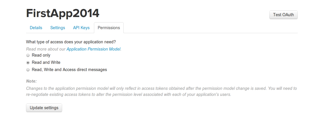 The next thing you need to do is to change the app access permission to write since we gonna post tweet to twitter. For to do, Goto - Permissions Tab - Change the access type to read and write - Click Update setting.